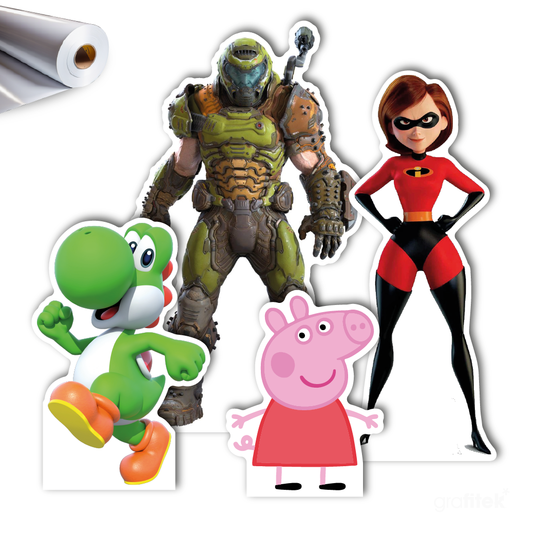 La pieza se troquela siguiendo el contorno exacto de la figura, logrando un acabado limpio y profesional. Además, incorpora soporte trasero (pata autoportante) que permite que se mantenga de pie por sí sola, ideal para exhibición en interiores.